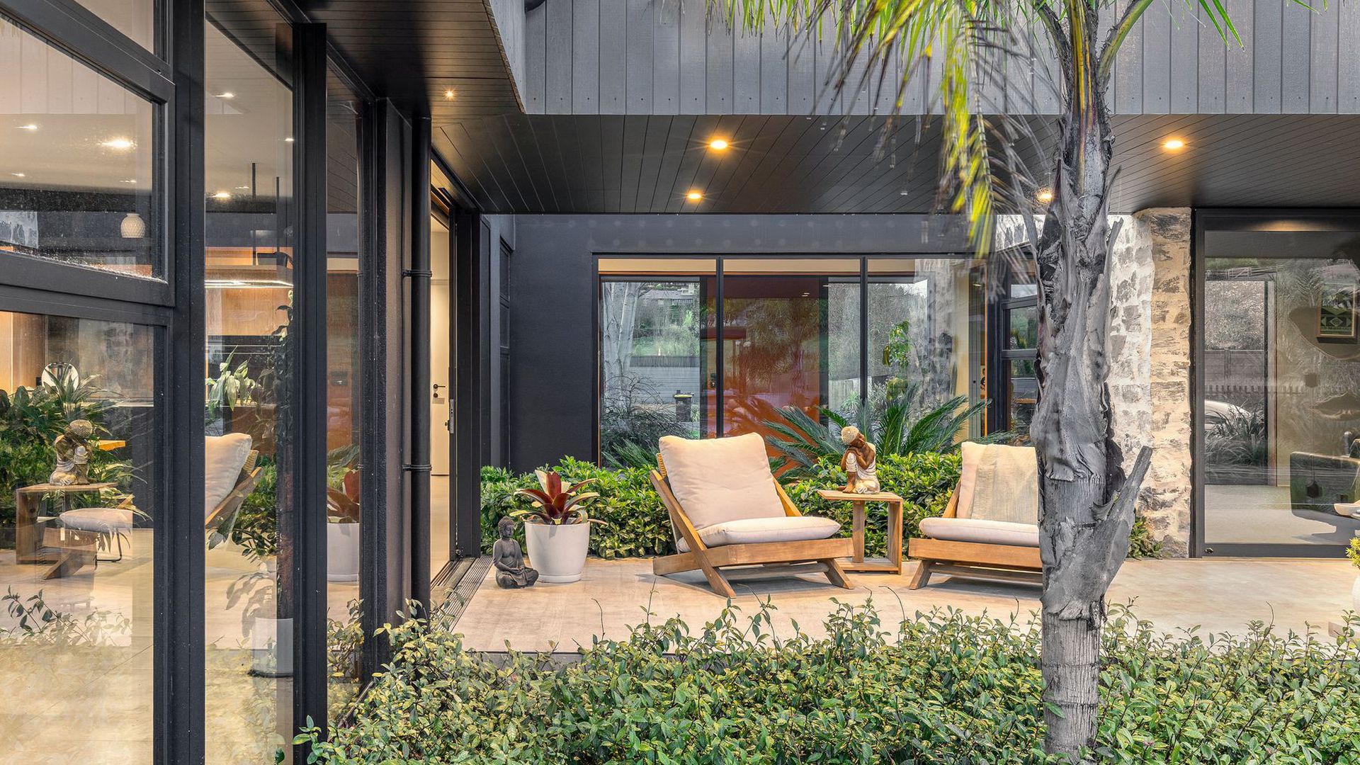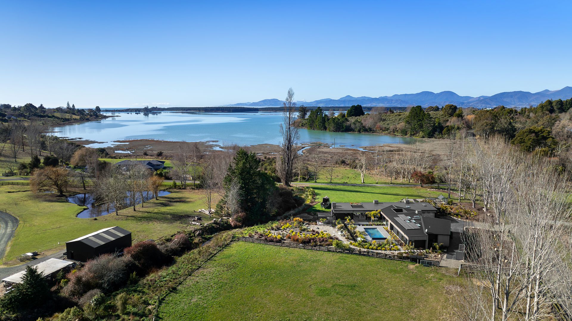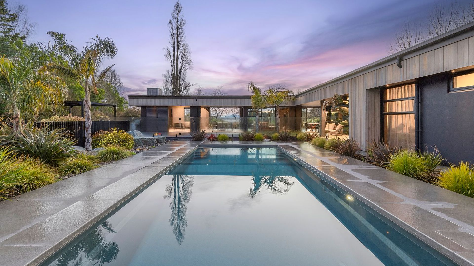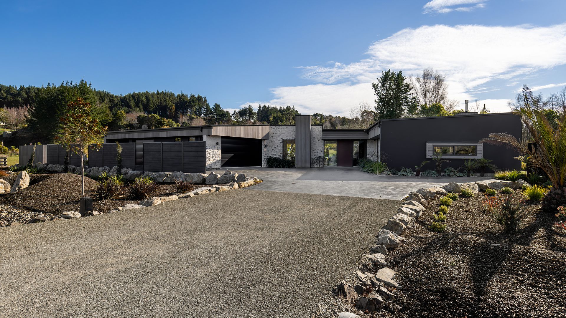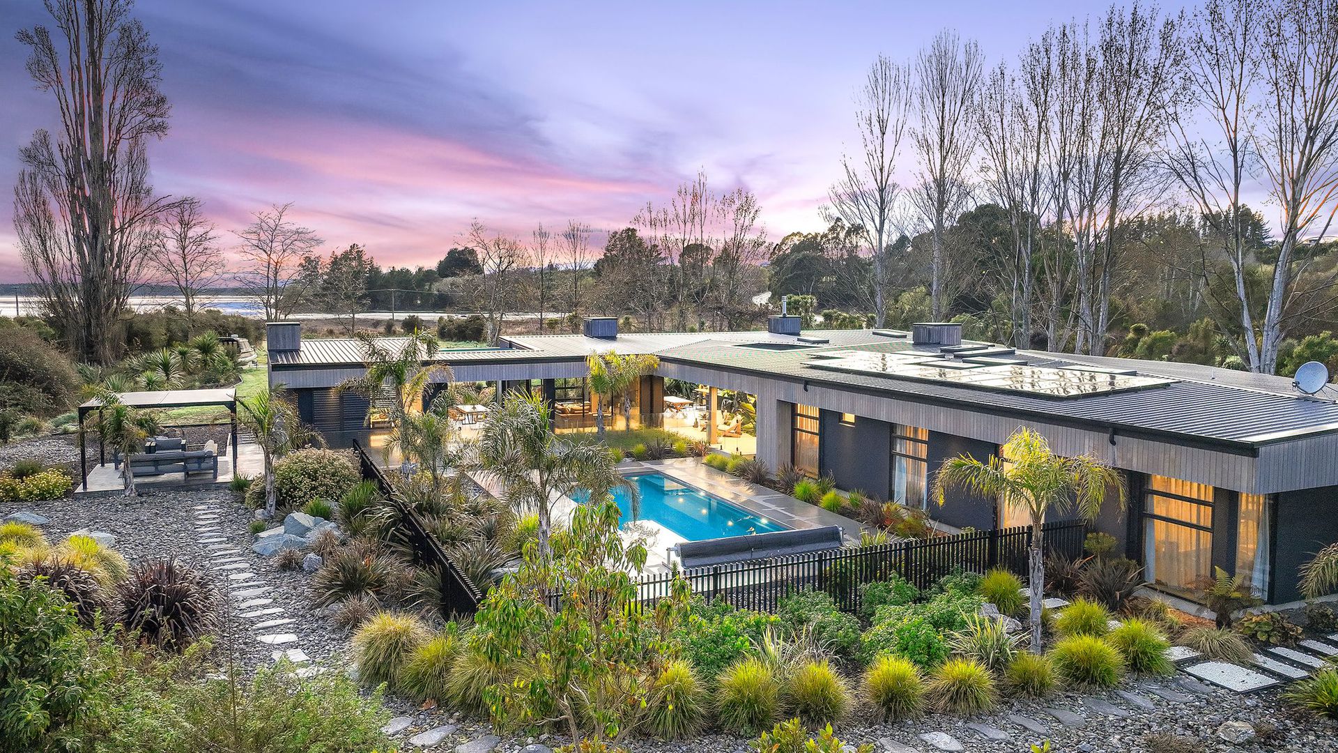 196 Westdale Road is a contemporary lifestyle estate conceived as a private retreat—architectural, composed, and deeply connected to its setting. Newly built and meticulously detailed, the home is anchored by natural schist accents that ground the architecture in the landscape, adding texture, permanence, and quiet sophistication. Two generous living areas unfold through expanses of glass, framing rolling land and estuary views that shift with the light and tide. From here, the home extends seamlessly to a large, covered outdoor living pavilion, where louvered screens offer shelter and control while maintaining a constant visual connection to the pool, expansive lawns, and water beyond.