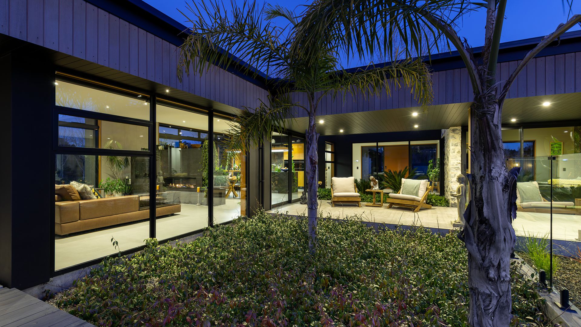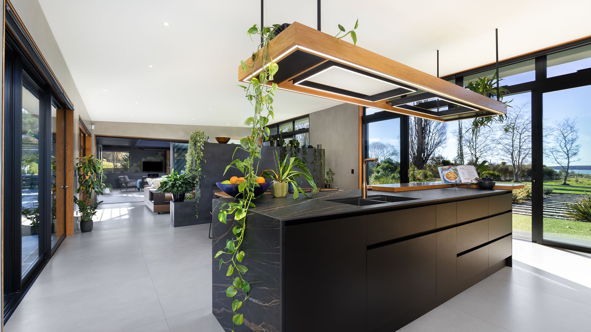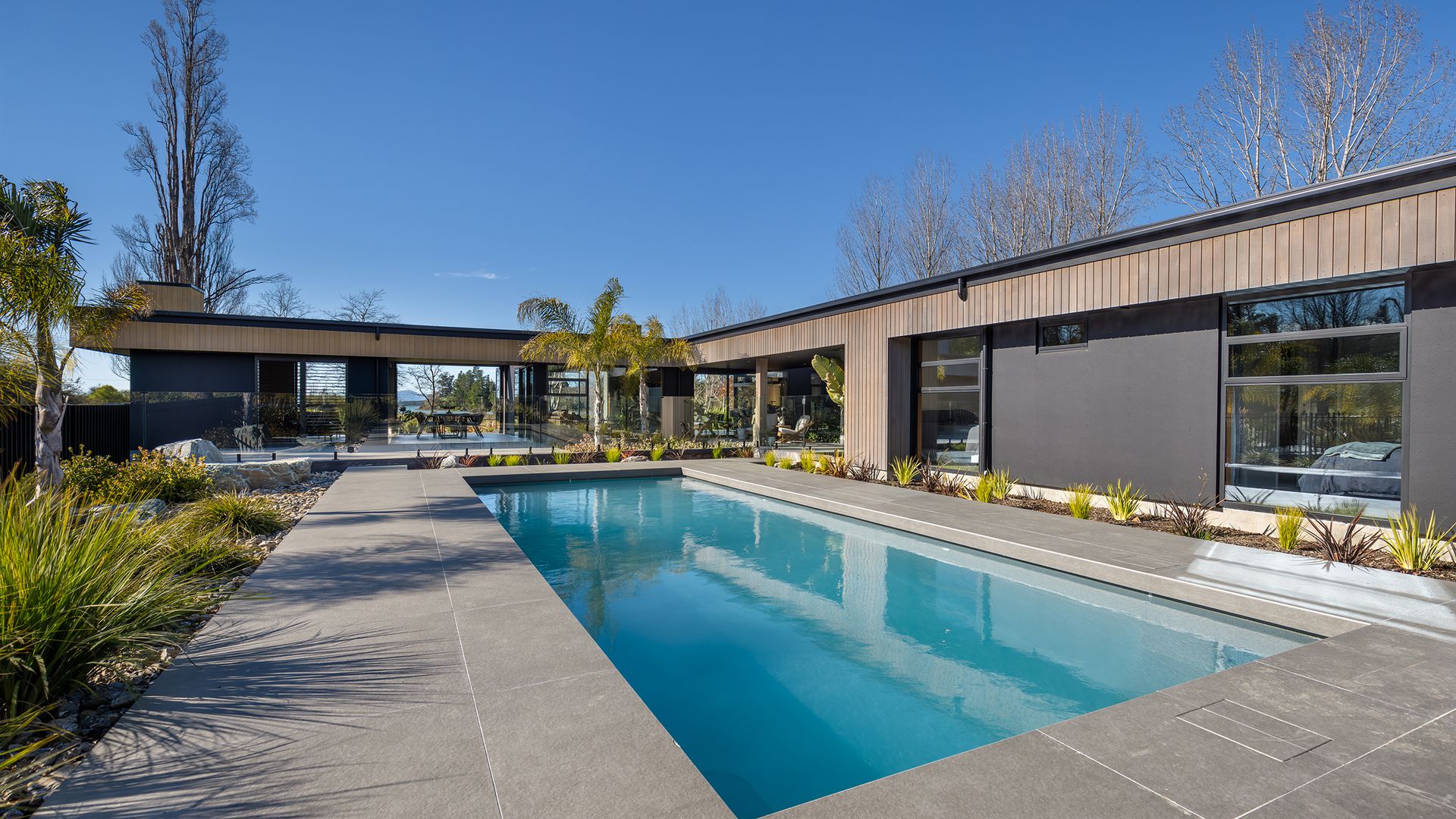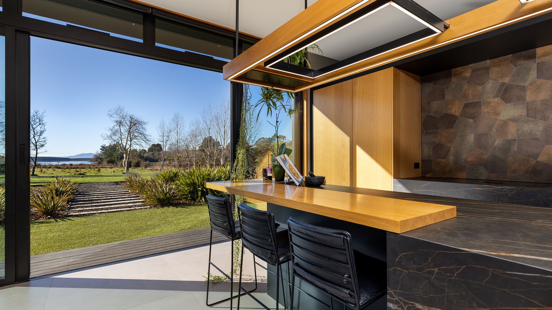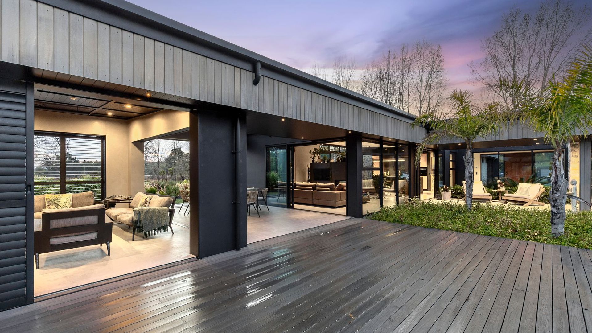 196 Westdale Road is a contemporary lifestyle estate conceived as a private retreat—architectural, composed, and deeply connected to its setting. Newly built and meticulously detailed, the home is anchored by natural schist accents that ground the architecture in the landscape, adding texture, permanence, and quiet sophistication. Two generous living areas unfold through expanses of glass, framing rolling land and estuary views that shift with the light and tide. From here, the home extends seamlessly to a large, covered outdoor living pavilion, where louvered screens offer shelter and control while maintaining a constant visual connection to the pool, expansive lawns, and water beyond.