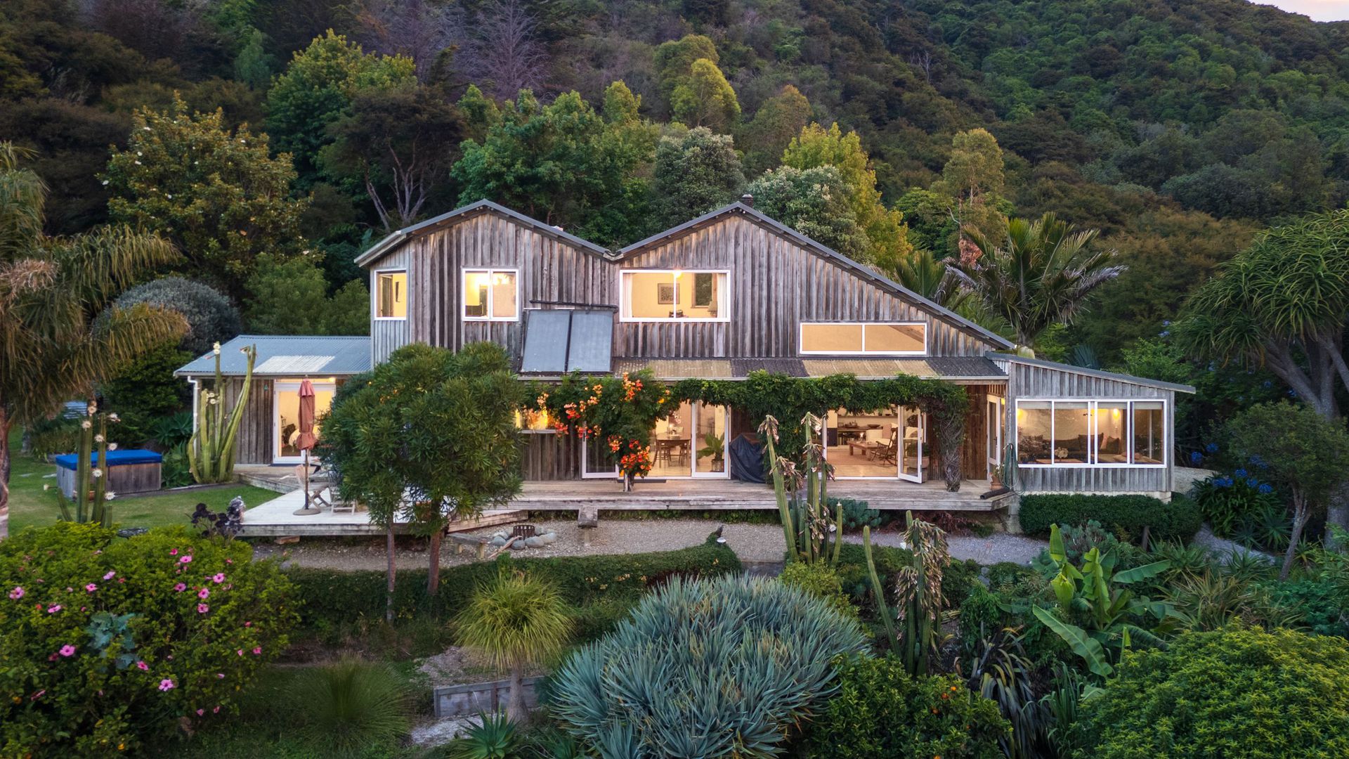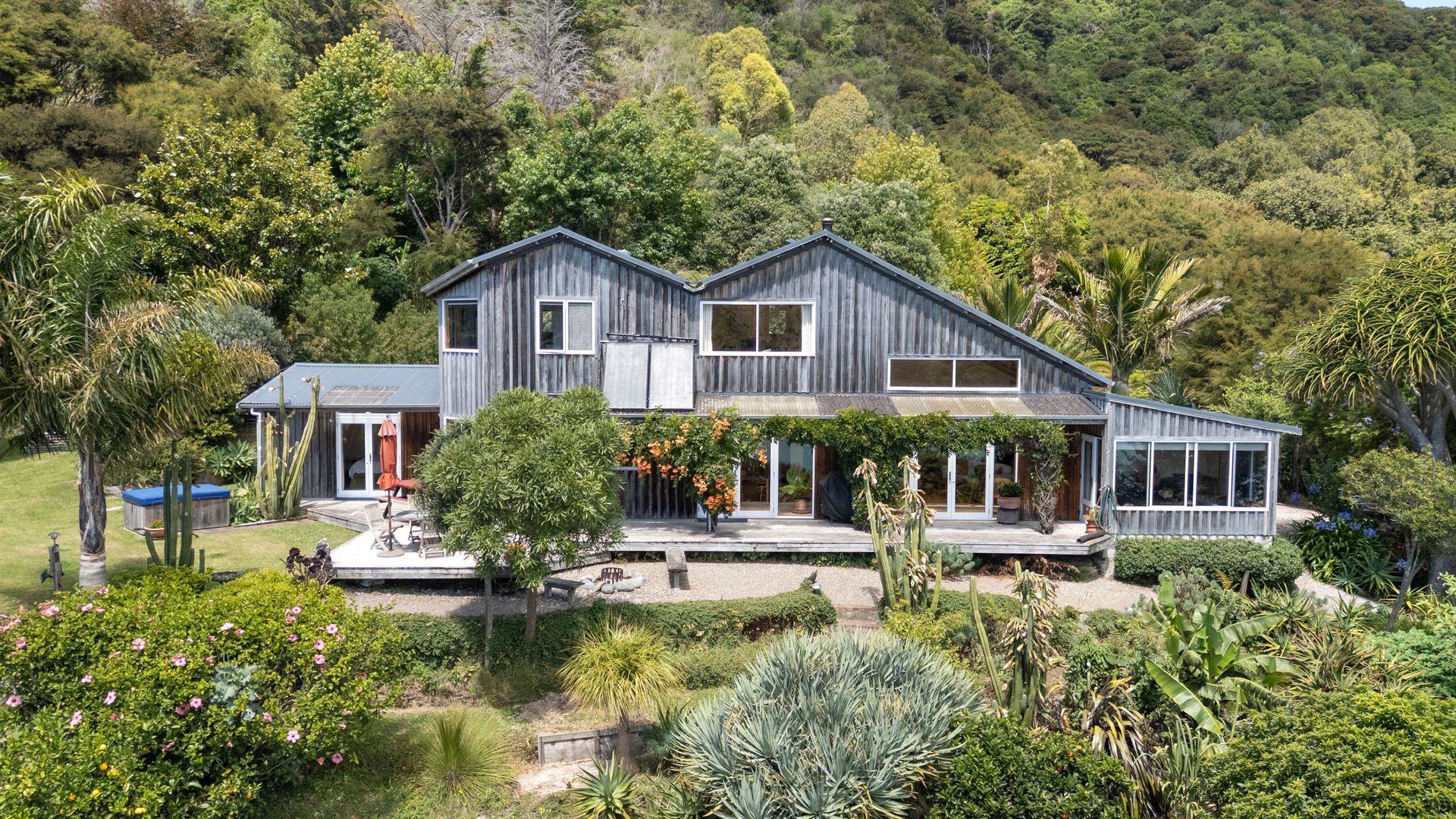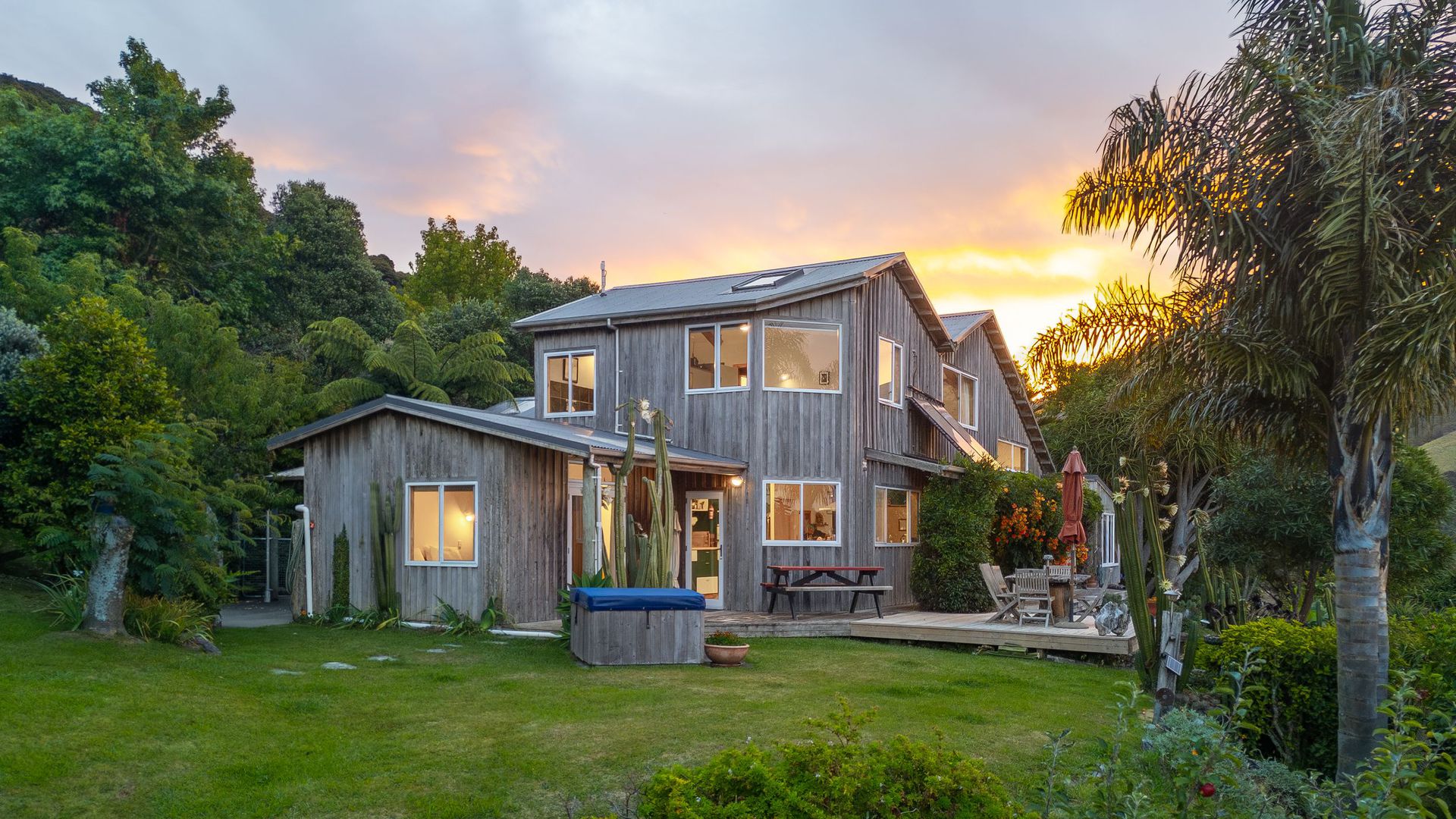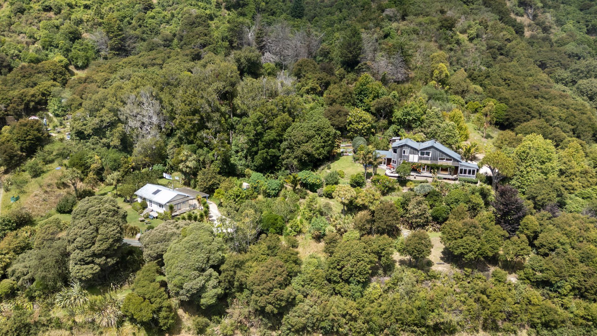 The property comprises two dwellings, offering flexible living options for extended family, guests, or home and income potential. The main two-storey residence features two bedrooms and two bathrooms, a sunroom bathed in natural light, and a charming mezzanine space ideal as a library nook, daybed retreat, or home office. All-day sun combines with a log burner to provide natural warmth and ambience. A separate two-bedroom cottage provides additional accommodation with its own sense of privacy, making it ideal for guests, extended family, or potential income. A heat pump ensures year-round comfort. The established gardens are glorious and thoughtfully curated, enhancing both privacy and connection to nature. They are abundant, featuring not only native plantings but also a myriad of fruit trees, adding richness and life to the grounds. Water is supplied via rain catchment, and the addition of solar hot water further enhances the property’s self-sufficient appeal, creating a lifestyle that is both sustainable and rewarding. This is a property for those seeking space, stillness, and perspective, a place to retreat from the hustle while remaining just 25 minutes from the city. Local cafes, a superette, petrol station, and primary school are nearby, with school bus pick-up available for colleges. A rare opportunity to secure an exceptional lifestyle property in one of the region’s most scenic coastal locations.