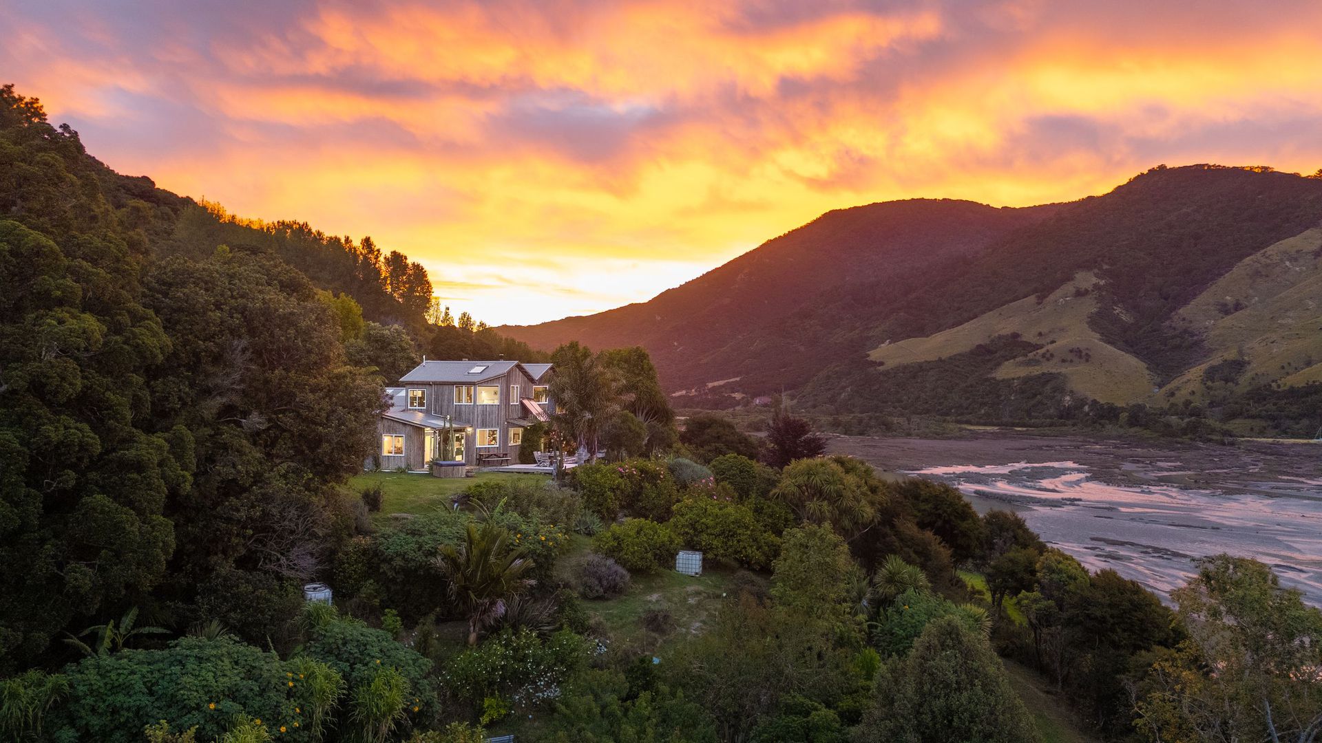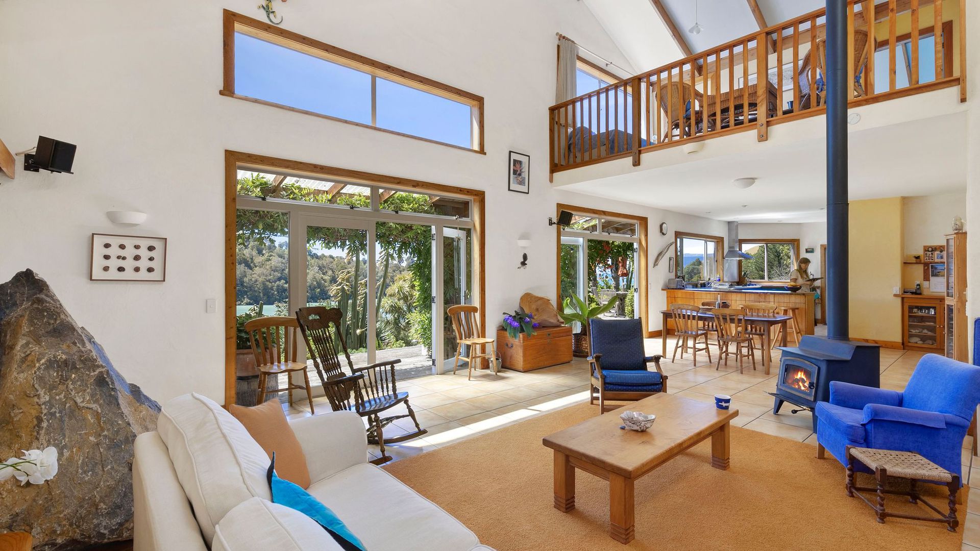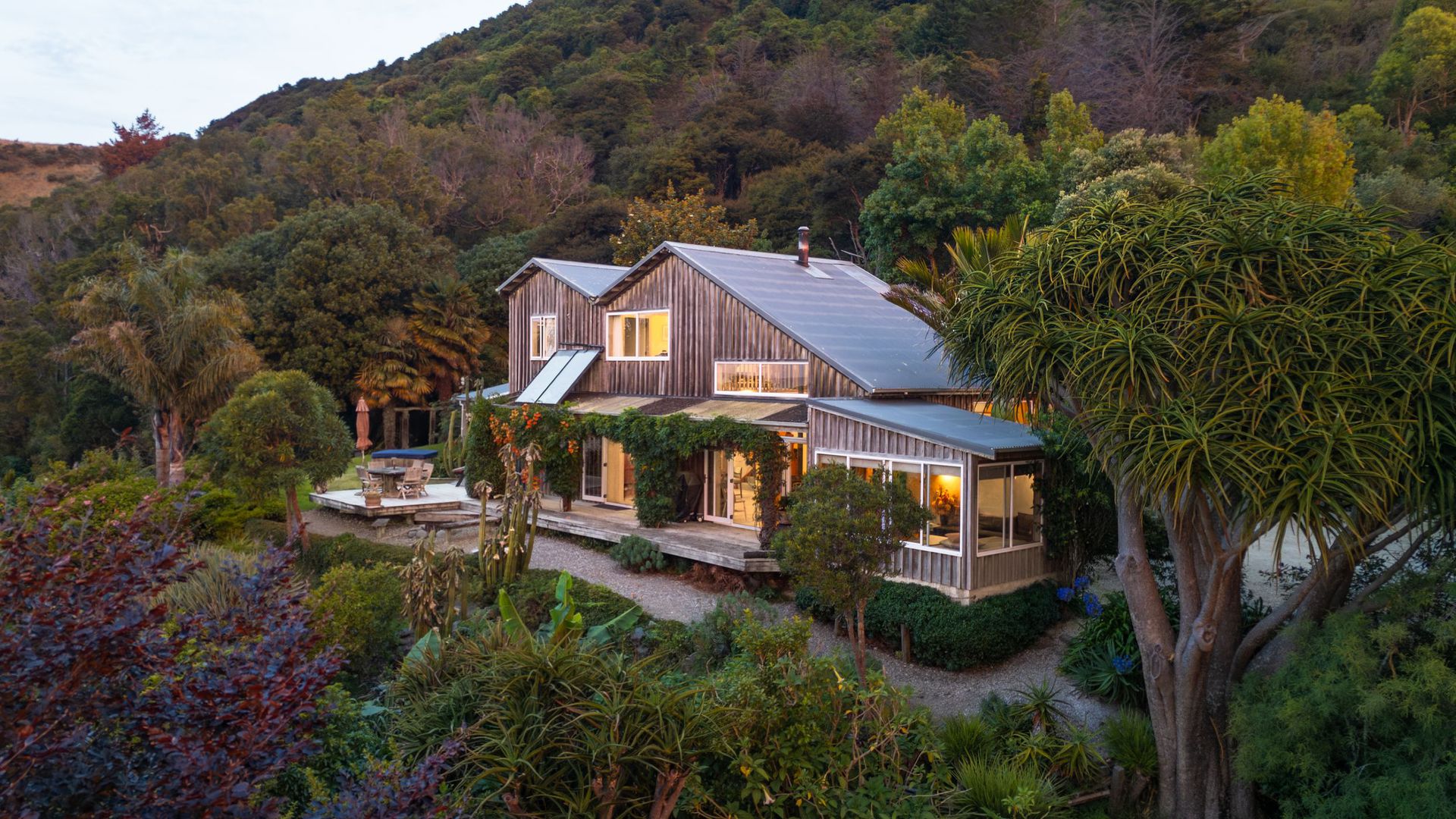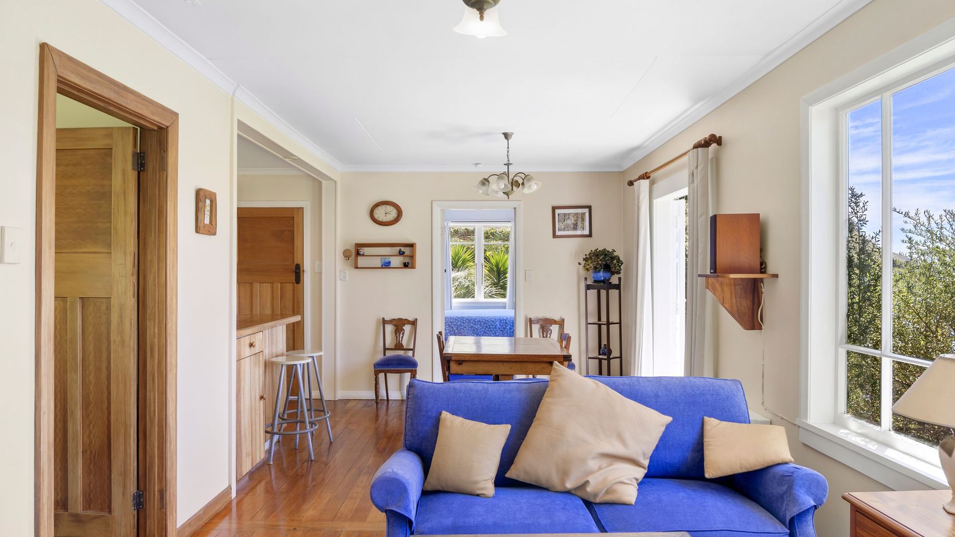 The property comprises two dwellings, offering flexible living options for extended family, guests, or home and income potential. The main two-storey residence features two bedrooms and two bathrooms, a sunroom bathed in natural light, and a charming mezzanine space ideal as a library nook, daybed retreat, or home office. All-day sun combines with a log burner to provide natural warmth and ambience. A separate two-bedroom cottage provides additional accommodation with its own sense of privacy, making it ideal for guests, extended family, or potential income. A heat pump ensures year-round comfort. The established gardens are glorious and thoughtfully curated, enhancing both privacy and connection to nature. They are abundant, featuring not only native plantings but also a myriad of fruit trees, adding richness and life to the grounds. Water is supplied via rain catchment, and the addition of solar hot water further enhances the property’s self-sufficient appeal, creating a lifestyle that is both sustainable and rewarding. This is a property for those seeking space, stillness, and perspective, a place to retreat from the hustle while remaining just 25 minutes from the city. Local cafes, a superette, petrol station, and primary school are nearby, with school bus pick-up available for colleges. A rare opportunity to secure an exceptional lifestyle property in one of the region’s most scenic coastal locations.
